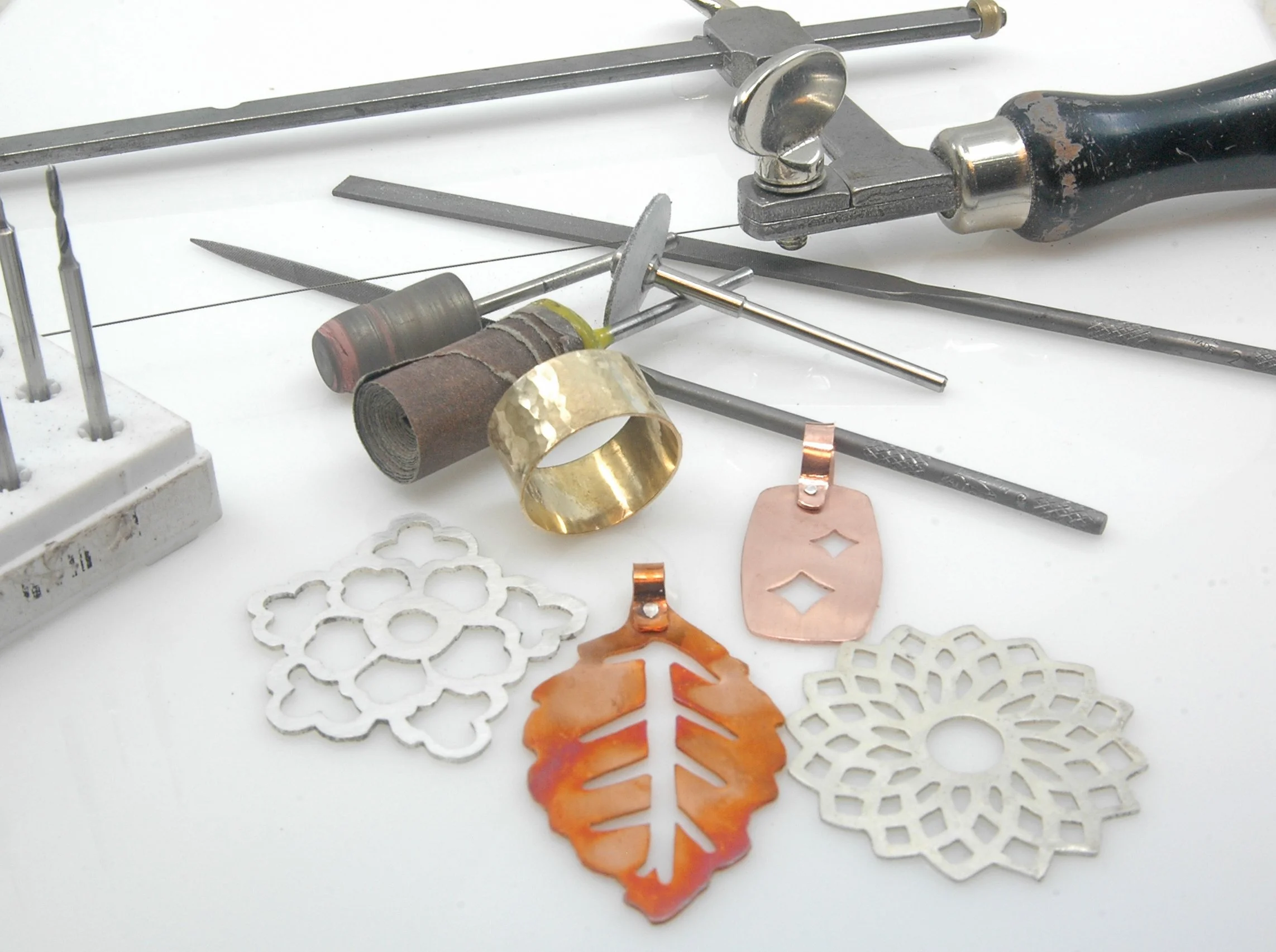 This 4 week series offers new metalsmiths the skills essential to making beautiful jewelry in copper, brass and silver. Participants will gain knowledge from an experienced metalsmith and will make 2 pieces of jewelry, through sawing, texturing, shaping, basic soldering skills and cold connections with rivets. At the end of 4 weeks, leave with a finished pendant and ring band. For additional practice time in the studio, participants can attend a weekly Open Studio session, to use the tools under guidance from a studio monitor.